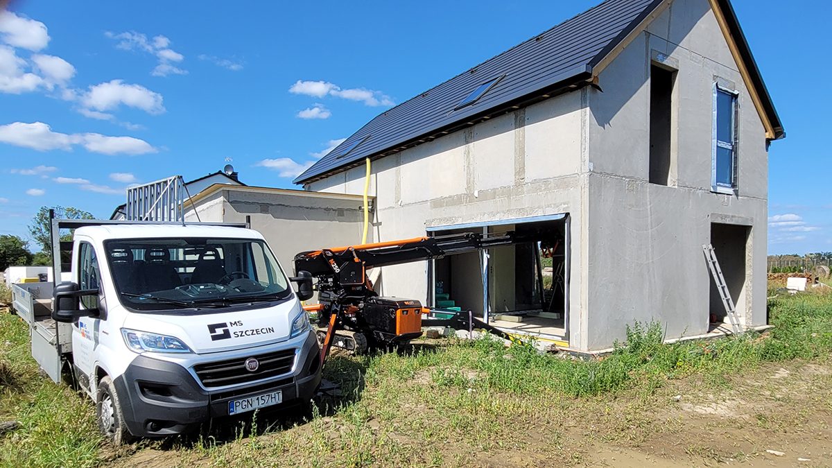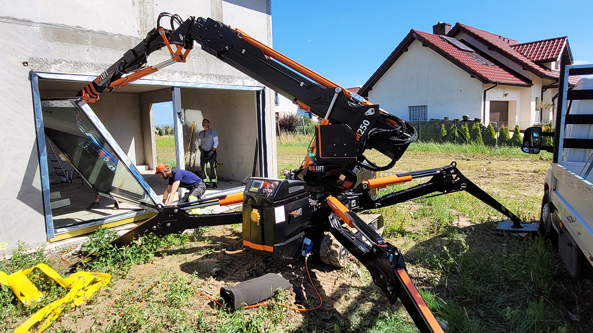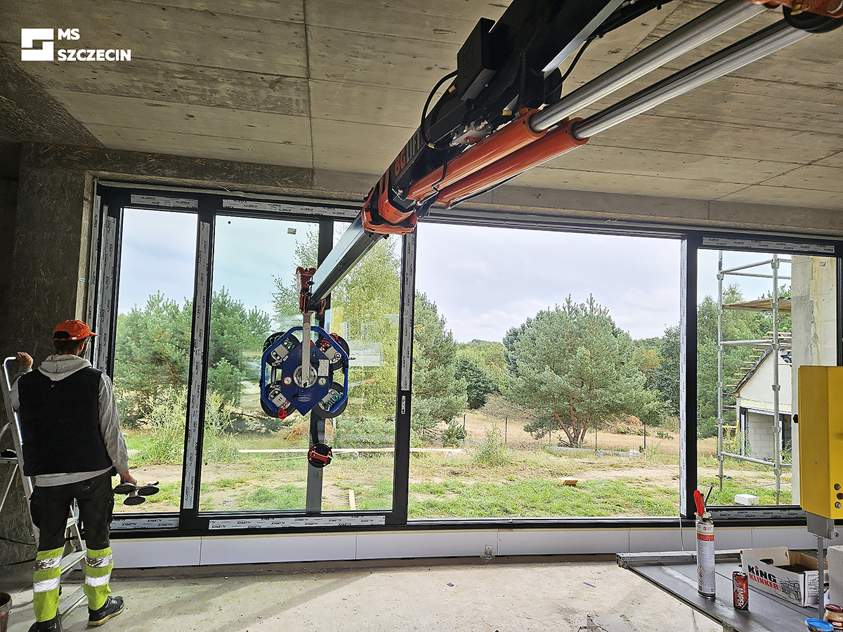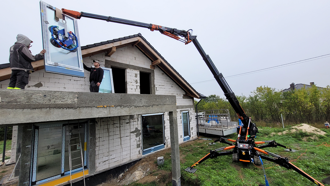Montaż okien za pomocą mini żurawia i przyssawki próżniowej.